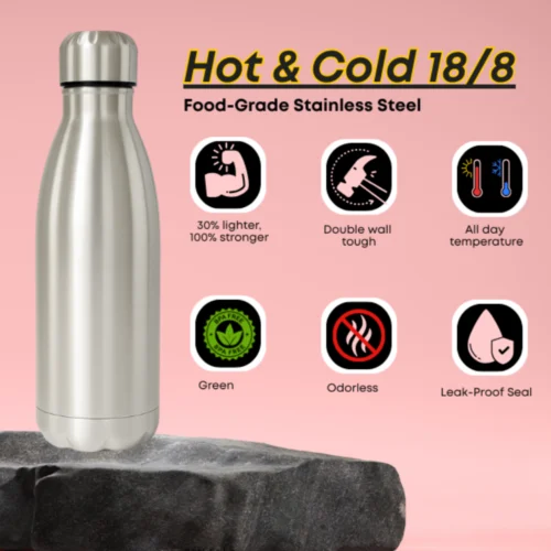 1000ml stainless steel water bottle is designed to keep your beverages at the perfect temperature for extended periods. Its double-wall vacuum insulation ensures that hot drinks stay hot and cold drinks stay cold for hours. Made from high-quality stainless steel, it is durable, BPA-free, and resistant to rust and corrosion. The sleek design features a leak-proof cap and a convenient carry handle, making it ideal for daily use, travel, or outdoor activities. Whether you’re commuting, hiking, or at the gym, this bottle is your reliable companion for hydration on the go.